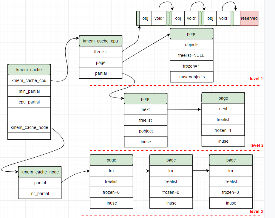 struct kmem_cache_cpu {void **freelist; /* Pointer to next available object */unsigned long tid; /* Globally unique transaction id */struct page *page; /* The slab from which we are allocating */