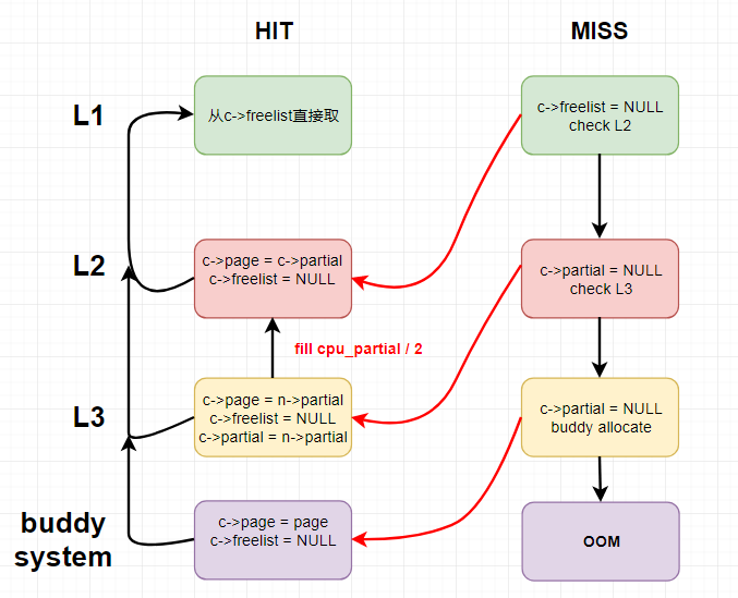 - L1 MISS, L2 MISS, L3 MISS,在伙伴系统中分配一个slab挂到L1(c->page)上