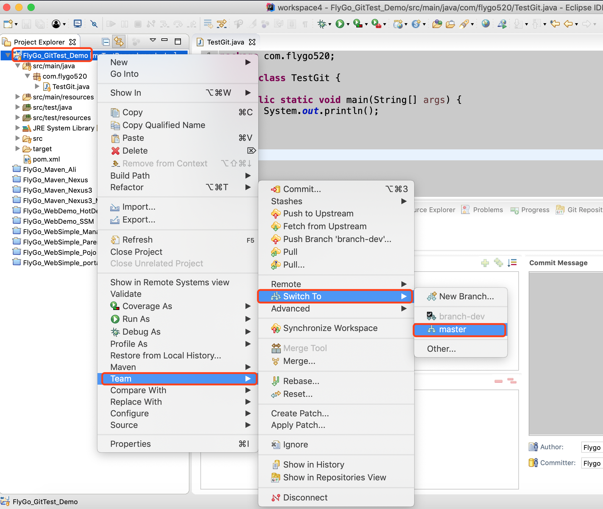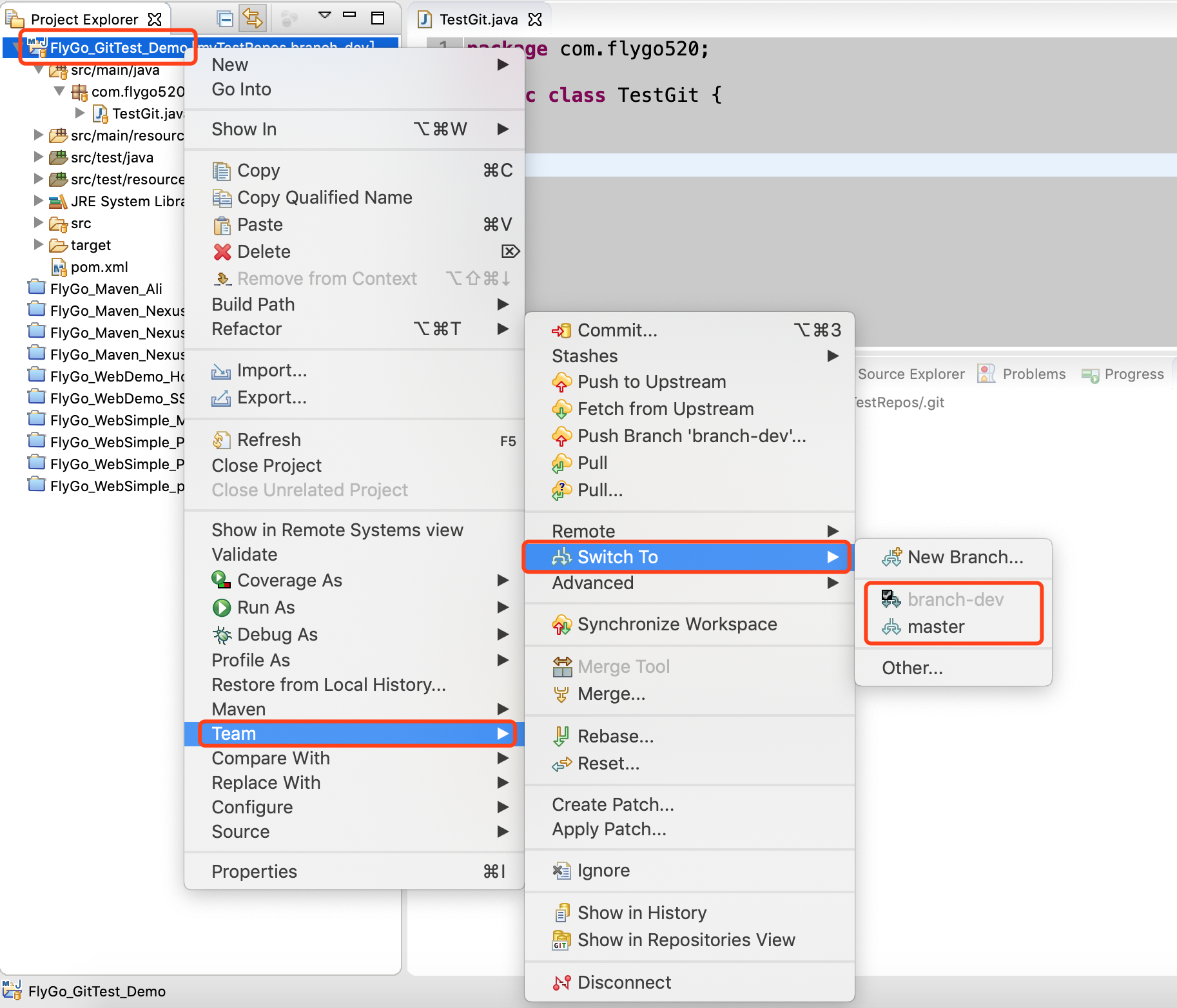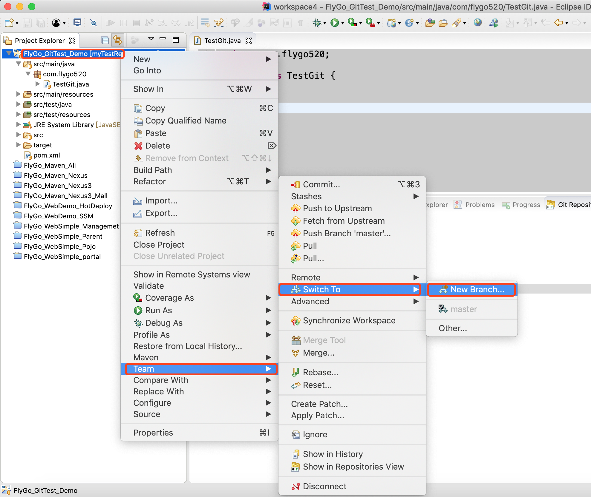 1.1、右键选择工程 –> 选择 Team –> 选择 Switch To –> 选择 New Branch...