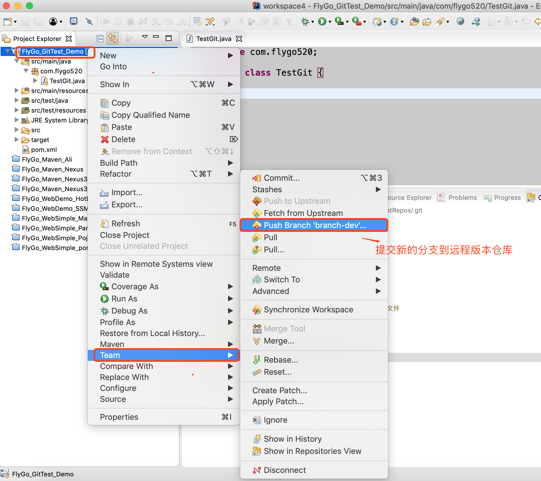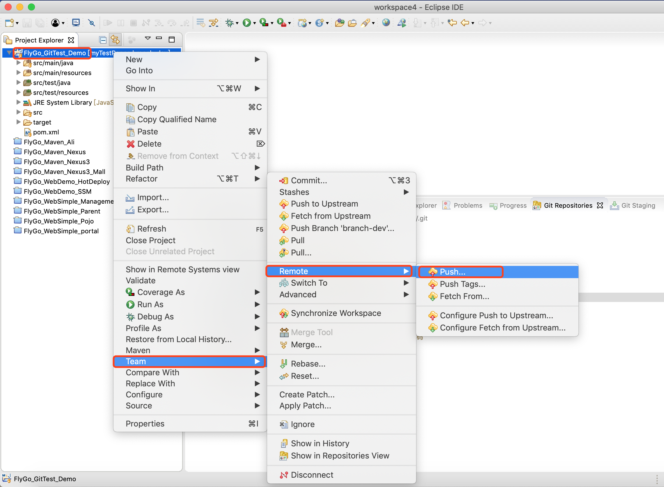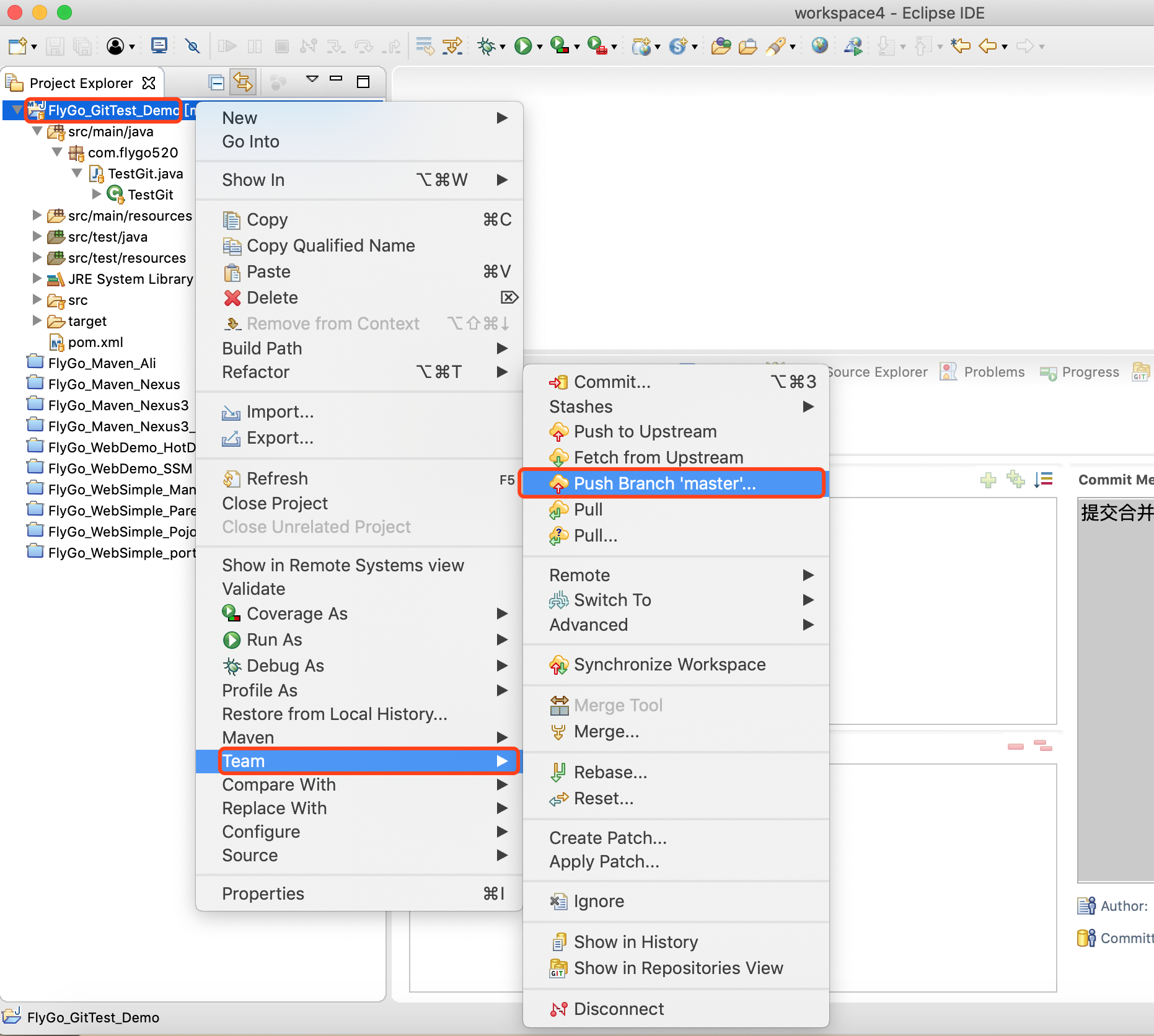 右键工程 –> 选择 Team –> 选择 Remote –> 选择 Push...