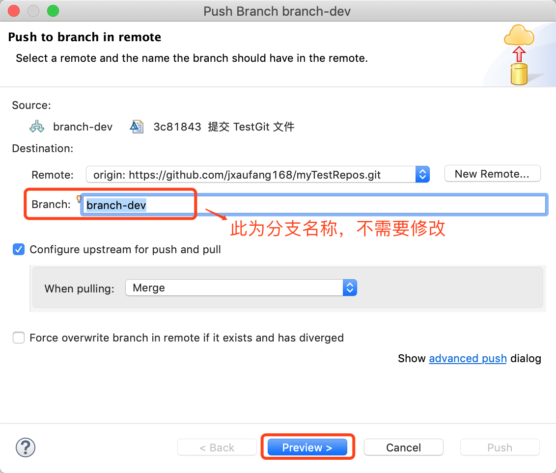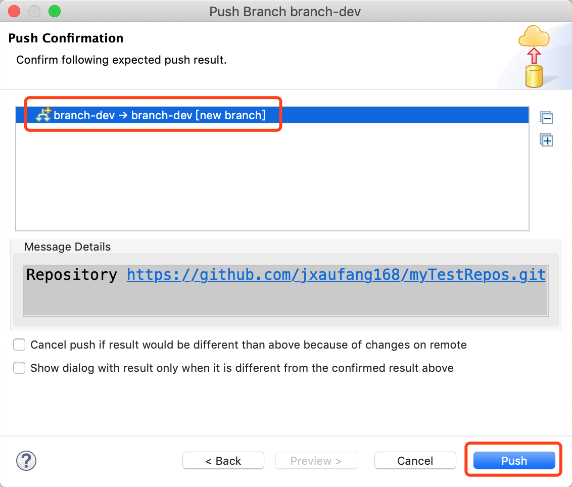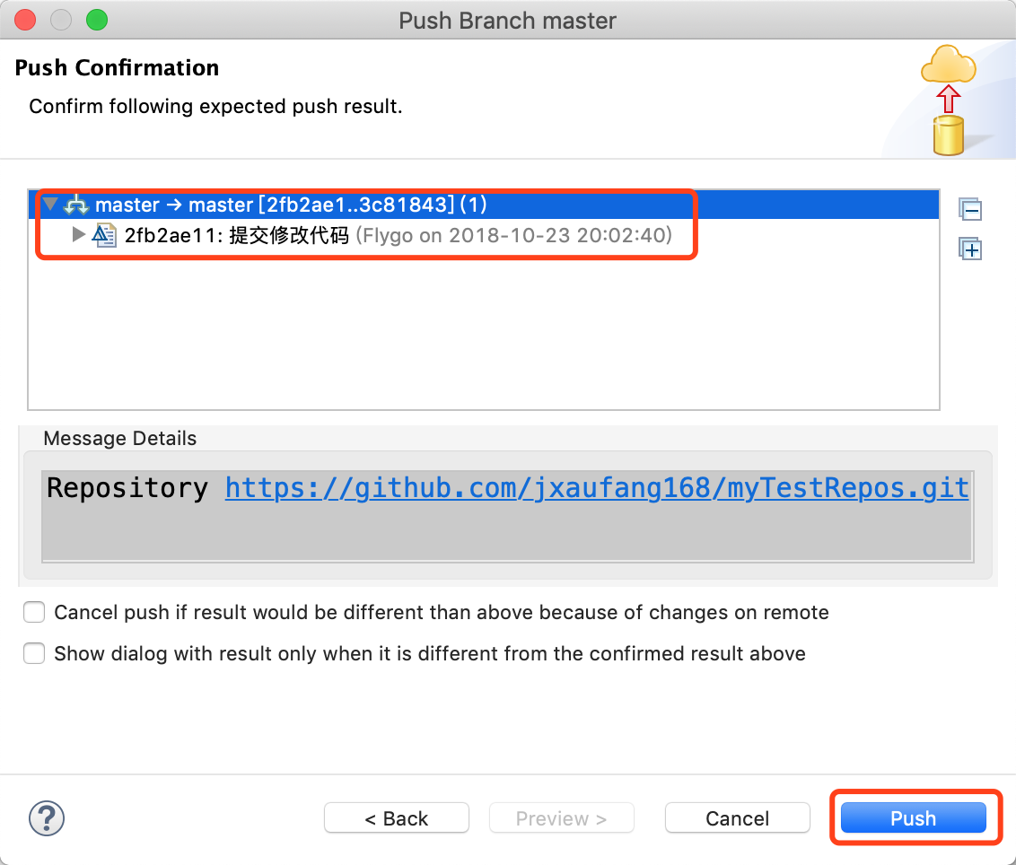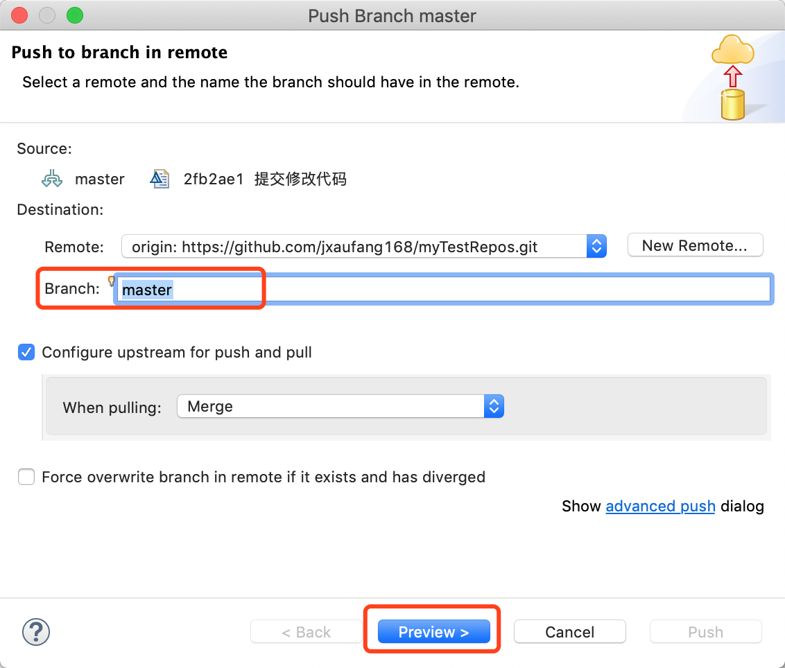 3.7、选择 Preview –> 选择 Push,推送到远程版本仓库。