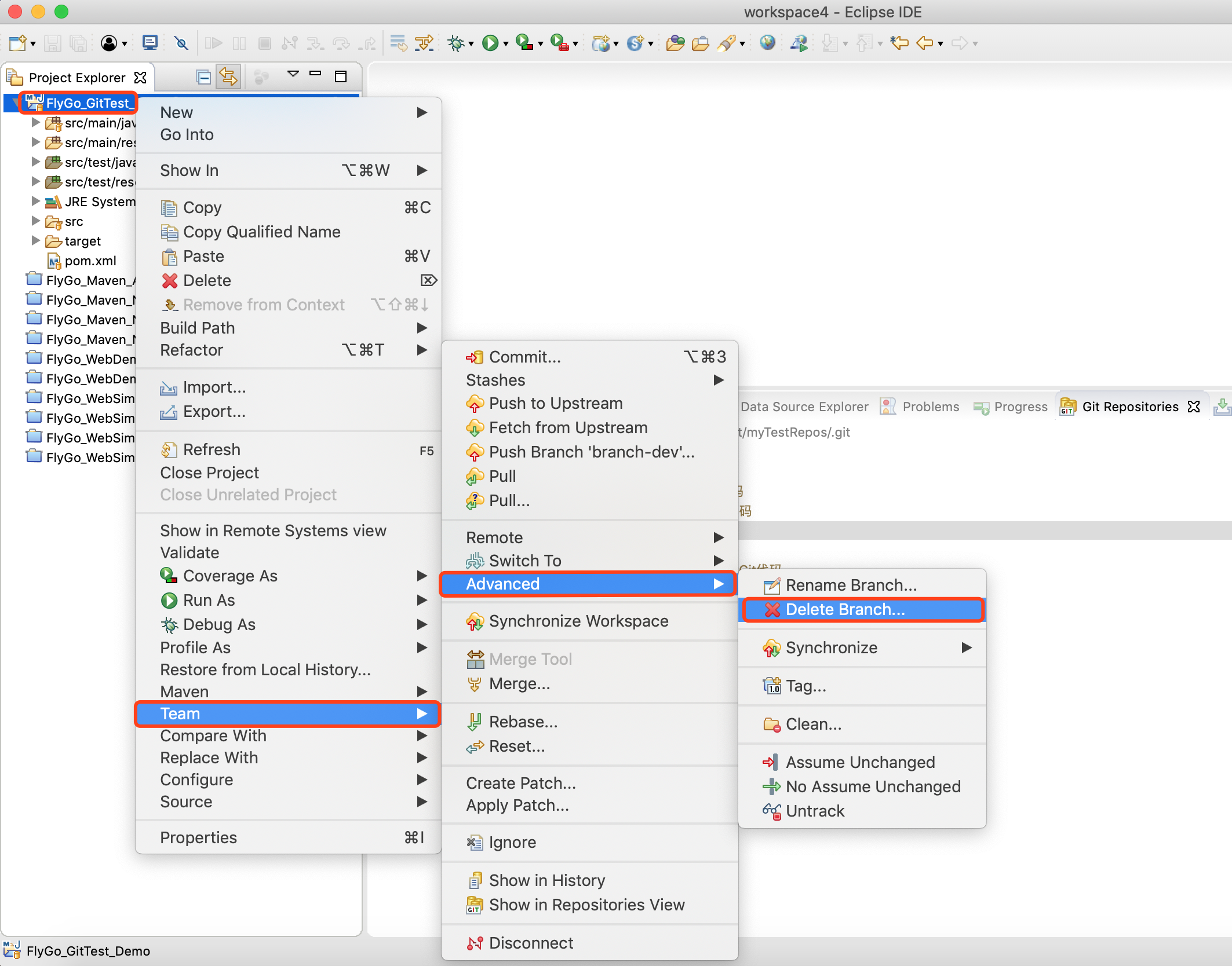 4.1、右键工程 –> 选择 Team –> 选择 Advanced... –> 选择 Delete Branch...